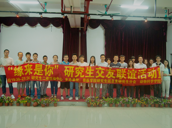 4月20日19:30,第二届华南农业大学交友联谊会“缘来是你”在研究生活动中心顺利举行。此次活动由广州华农大实验兽药有限公司赞助,兽医学院和动物科学学院研究生团总支研究生会联合举办。大会吸引了近百位来自不同学院的研究生参与其中,大大促进了各学院研究生之间的交流,极大地丰富了研究生的课余生活,并为研究生创造了良好的结识异性的平台和机会。