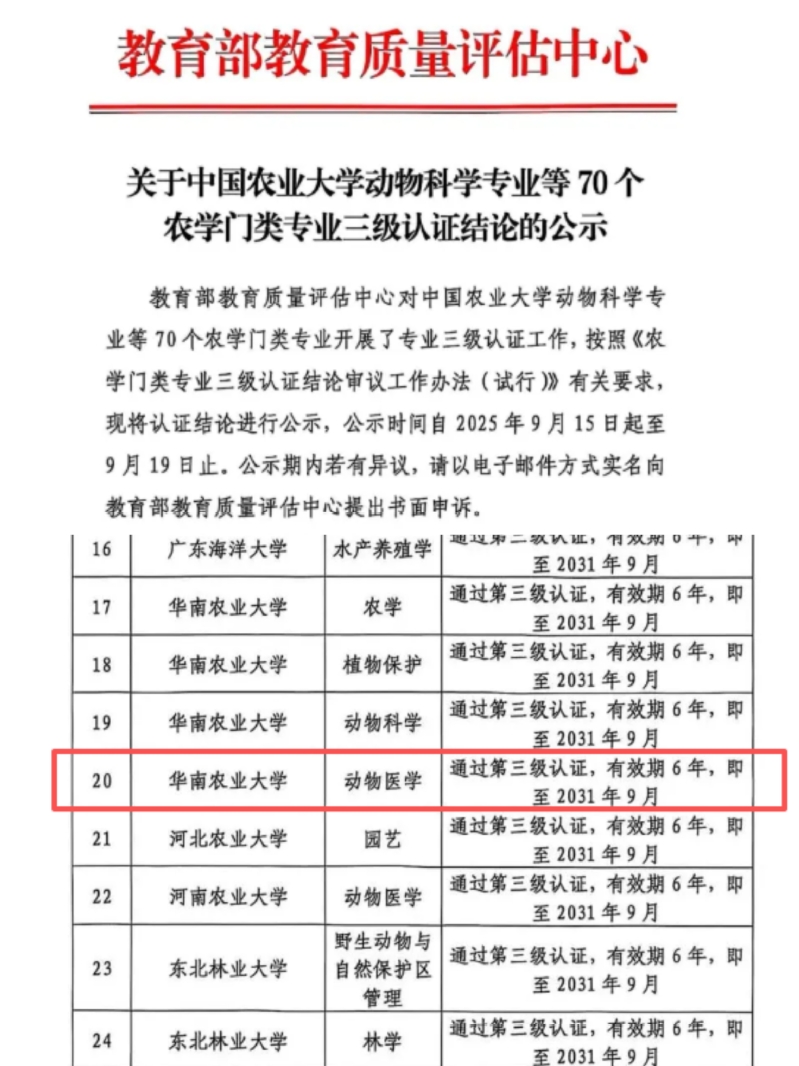 近日,教育部教育质量评估中心发布关于中国农业大学动物科学专业等70个农学门类专业三级认证结论的公示。我校动物医学专业在列,标志着本专业已通过首批全国农学门类专业三级认证,有效期为6年。