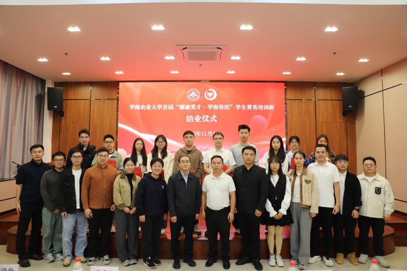 2025年11月4日下午,华南农业大学首届“德康英才·华南兽医”学生菁英培训班结业仪式在兽医学院101报告厅隆重举行。德康集团家禽事业部郁南公司总经理田伟宏先生、智威公司综合部经理张桂花女生、人事行政专员冯帅杰先生,生猪事业部广东区域综合部经理刘波先生、人力负责人陈星宇先生、饲料厂技术专员覃杰女士、综合部行政专员梁力成先生,兽医学院党委书记戴雪飞、党委副书记陈晓梅以及全体辅导员,培训班学员和各年级学生代表出席了结业仪式。活动由学院学工办主任(组织员)、德康班班主任谢庆彪主持。