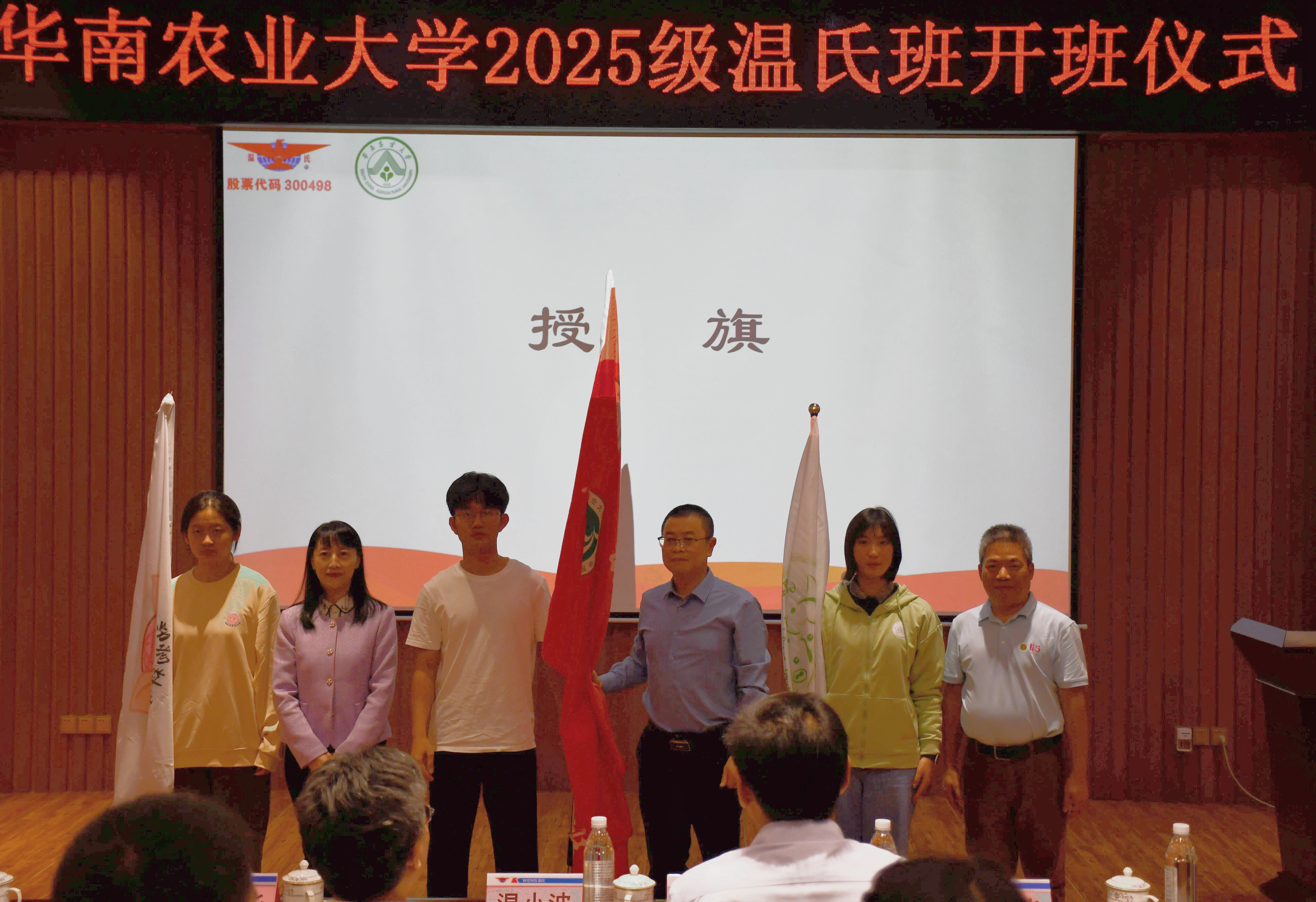 最后,人力资源部(温氏学院)总经理晏培华、研究生院院长钟国华、本科生院副院长王金凤分别为研究生温氏兴农创新班、2025级动物医学(温氏班)、动物科学(温氏班)授予班旗。学院副院长孙坚为企业班主任张堂知颁发班主任聘书。