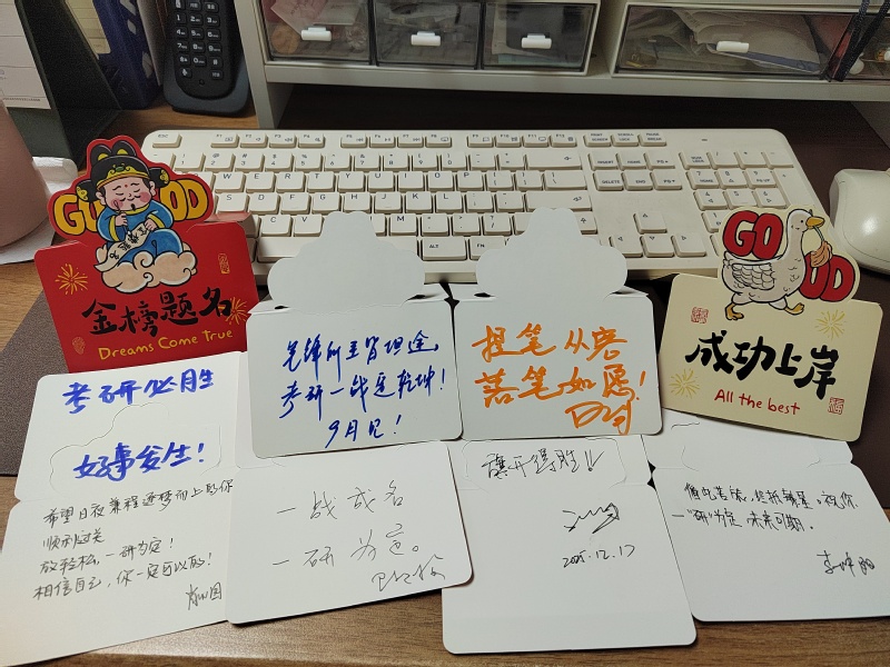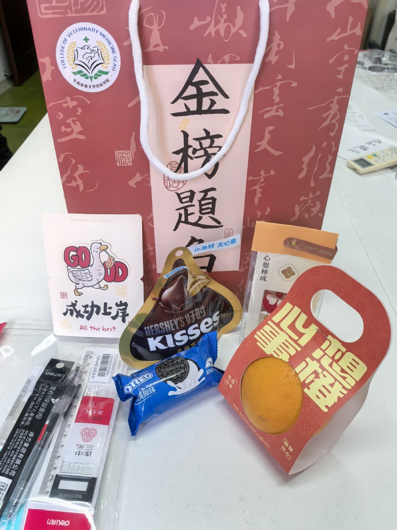 为表达对考研学子深切的祝福与鼓励,学院领导还精心准备了寓意丰富的加油礼包,其中包括“橙”意满满的橙子、象征“好事”发生的巧克力、“奥利给”的饼干、心想“柿”成的香包、老师们亲笔写的祝福卡片以及妙“笔”生花的文具套装,寓意着同学们在考研战场上能够大展锋芒,收获满满。
