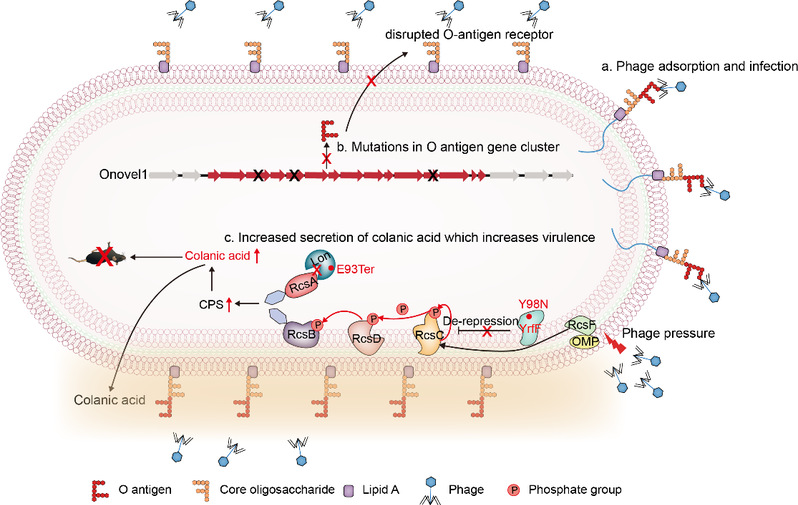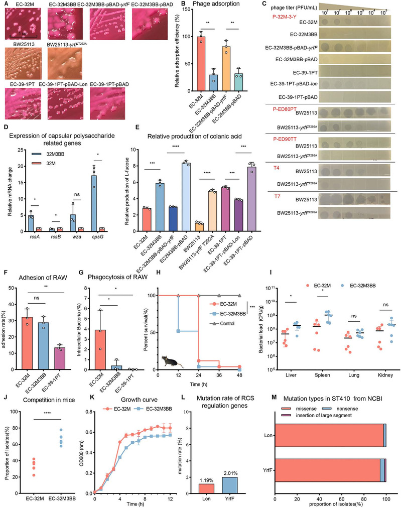 该研究围绕“噬菌体抗性进化是否会影响细菌毒力”这一关键科学问题,以在全球各生态位广泛传播的高风险克隆株E. coliST410为研究对象,系统解析了细菌在噬菌体压力下获得抗性的分子机制及其生物学后果。研究发现,除了通过噬菌体受体突变介导噬菌体抗性外,细菌可通过大量上调胞外多糖--可拉酸(colanic acid)合成,在细胞表面形成保护性屏障,从而有效阻断噬菌体的吸附与侵染,产生稳定的噬菌体抗性表型。值得注意的是,可拉酸分泌增多不仅影响噬菌体-细菌相互作用,还可增强细菌对宿主免疫细胞的抵御能力,从而提高细菌的毒力。