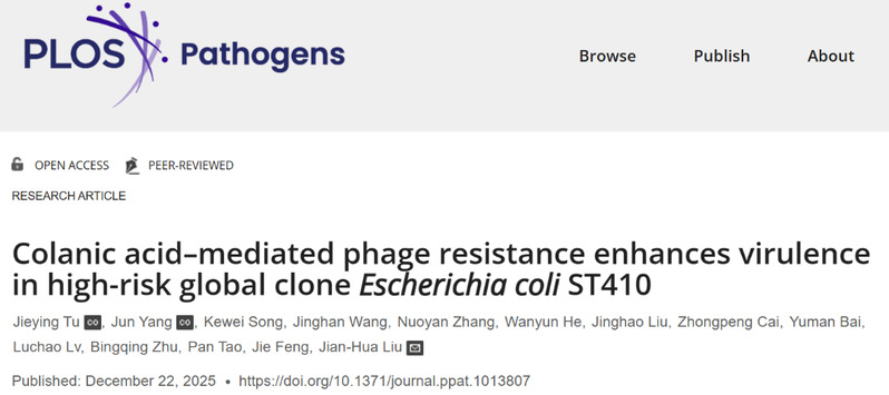 近日,兽医学院博士研究生涂婕莹以第一作者身份在国际知名期刊《PLOS Pathogens》 (中科院微生物学一区Top期刊)发表题为“Colanic acid–mediated phage resistance enhances virulence in Escherichia coliST410”(https://journals.plos.org/plospathogens/article?id=10.1371/journal.ppat.1013807)的研究论文,揭示了噬菌体抗性与细菌毒力之间的复杂关联。