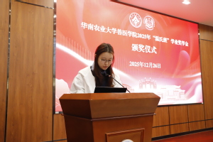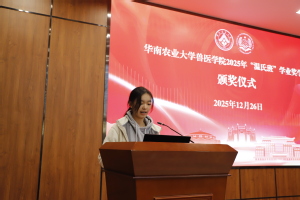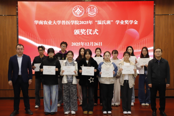 12月26日下午,华南农业大学兽医学院2025年“温氏班”学业奖学金颁奖仪式在学院科技楼101报告厅举行。兽医学院党委书记戴雪飞,党委副书记陈晓梅,温氏集团人力资源部(温氏学院)副总经理、23级动物医学温氏班班主任周龙海,辅导员老师以及2023级、2024级、2025级动物医学(温氏班)全体学生出席仪式。仪式由陈晓梅副书记主持。