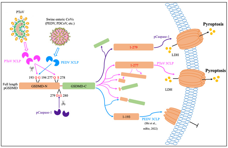 由于猪肠道冠状病毒与PToV在猪场中普遍存在,均引起仔猪腹泻,但前者临床致病性较强,而后者一般认为较弱,这可以部分地通过其不同3CLP诱发焦亡的后果加以解释:猪冠状病毒3CLP抑制焦亡,有利于病毒在宿主细胞感染,而PToV 3CLP促进焦亡释放炎症因子,限制了PToV的传播。因此,尽管pGSDMD都是凸隆病毒和冠状病毒3CLP的细胞识别底物,但是效应则完全相反。