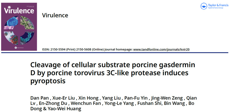 近日,华南农业大学兽医学院/动物疫病防控全国重点实验室黄耀伟教授指导的博士研究生潘丹以独立第一作者在《Virulence》杂志(中科院一区Top期刊)在线发表题为"Cleavage of cellular substrate porcine gasdermin D by porcine torovirus 3C-like protease induces pyroptosis"的研究工作(Virulence, 2026,17(1):2605749;文章链接:https://doi.org/10.1080/21505594.2025.2605749),首次鉴定出一种新发病毒——猪凸隆病毒(PToV)主要蛋白酶的宿主底物,猪gasdermin D(pGSDMD)。