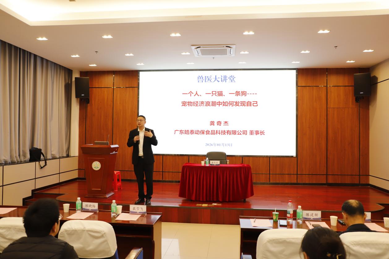 1月13日下午,广东皓泰动保食品科技有限公司董事长龚奇杰一行来到兽医学院进行交流,学院在科技楼101报告厅举办专题活动,并同步开启兽医大讲堂。兽医学院党委书记戴雪飞、党委副书记陈晓梅,皓泰动保董事长龚奇杰,2024级动物医学丁颖创新班班主任陈建新老师,熊文广老师,学院辅导员老师及2024级动物医学丁颖班等学生共同参与。活动由黄竣聪老师主持。