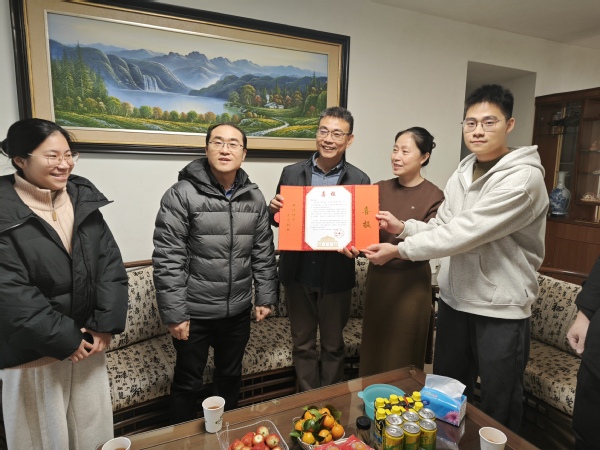 戴雪飞书记一行来到苏桐家中,亲手将国家奖学金获奖喜报递交到苏桐及其家人手中,并向他们表示热烈祝贺。喜报不仅象征着苏桐同学在学业、科研、综合素质等方面的突出表现,也凝聚着其个人的辛勤付出与家庭的默默支持。