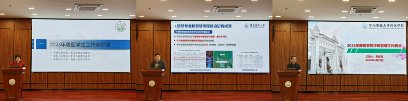 会上,党委副书记陈晓梅,副院长张建民、苏冠贤分别就分管工作进行了汇报和部署。陈晓梅副书记围绕党建、思政和学生工作汇报了2026年的工作要点和主要思路,强调要加强党建、学科、思政、社会(企业)融合,协力推动新时代新兽医人才培养和学科高质量发展。张建民副院长重点解读了本科教学工作的新举措以及国际交流与合作的最新进展和努力方向。苏冠贤副院长就实验室安全管理、资产管理、综合治理工作、校友工作等工作进行了汇报和工作部署。