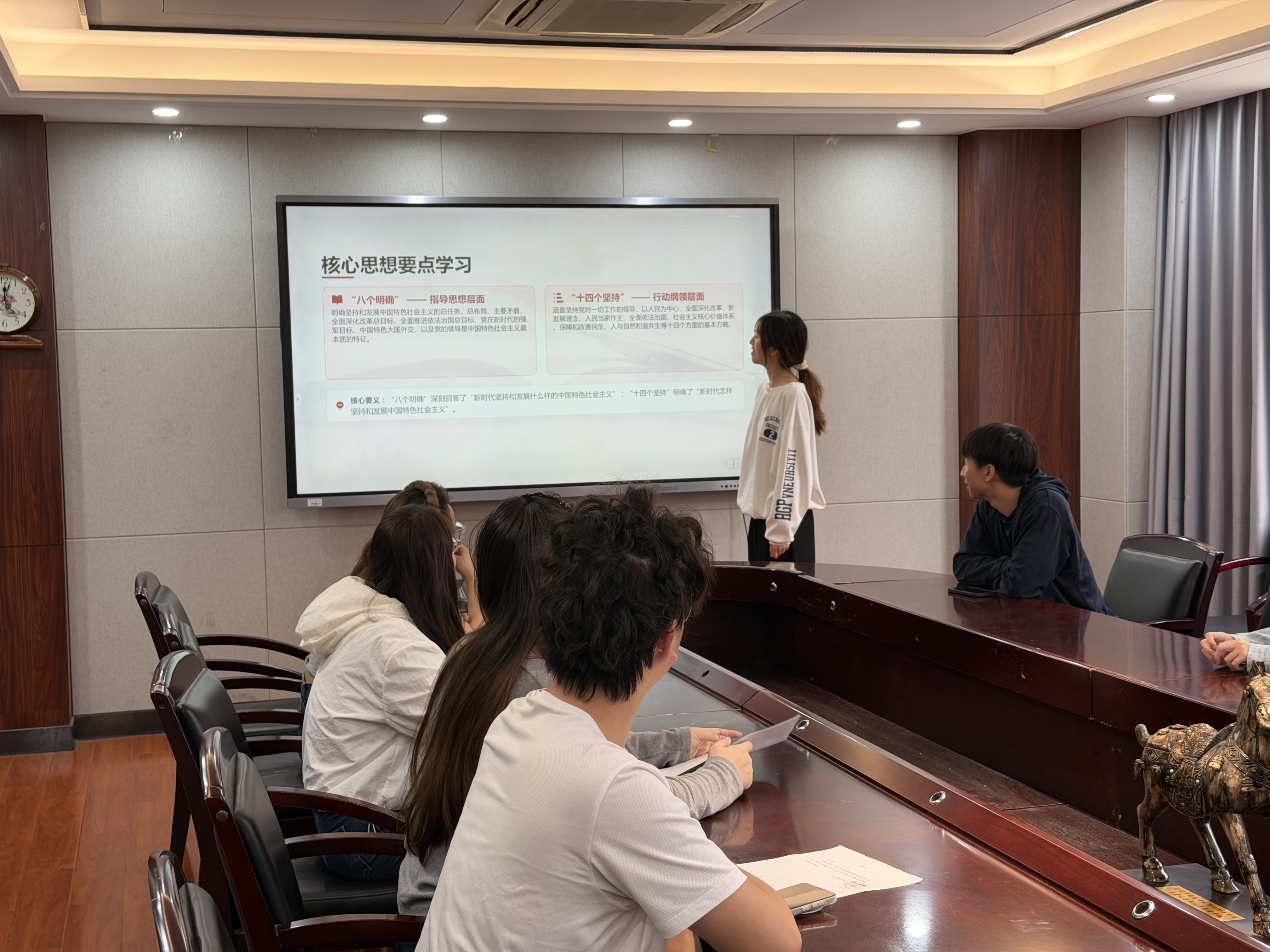 学习会上,首先由团委副书记讲解习近平新时代中国特色社会主义思想核心要点,围绕 “八个明确” 和 “十四个坚持” 两大方面展开系统阐述。之后结合理论内涵与时代背景,逐一解读 “八个明确” 作为指导思想层面的根本遵循,深刻回答新时代坚持和发展什么样的中国特色社会主义;并对 “十四个坚持” 的行动纲领进行讲解,明确新时代怎样坚持和发展中国特色社会主义,帮助参会人员准确把握核心要义与实践要求。随后,会议传达了省学联、校研会近期工作会议精神,对相关文件要求进行逐条解读,强调研究生会工作人员要提高政治站位,将理论学习与实际工作紧密结合,以更高标准、更严要求履行岗位职责。
