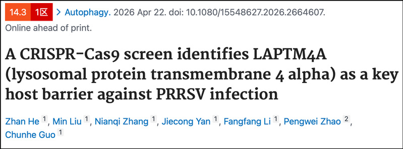 近日,华南农业大学兽医学院郭春和教授课题组及合作团队,在国际学术期刊《Autophagy》(中科院一区Top期刊,IF:14.3)和《Journal of Virology》(病毒学top期刊)发表两项关于猪繁殖与呼吸综合征(PRRS)的原创性研究成果,为PRRS防控提供重要理论基础与候选药物。