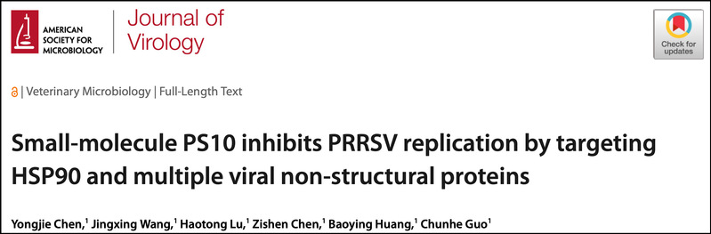 在抗病毒分子挖掘方面,团队通过小分子化合物库高通量筛选,成功鉴定到候选分子PS10,并系统验证了其抗PRRSV的效果与作用机制。实验证实,PS10在Marc-145与原代猪肺泡巨噬细胞(PAMs)中均可显著抑制PRRSV复制,且对多种PRRSV毒株均表现出强效抗病毒活性。其作用机制包含两条路径:一是下调病毒复制所必需的宿主因子HSP90,干扰PRRSV生命周期;二是特异性靶向PRRSV关键非结构蛋白,降低其蛋白稳定性与表达丰度,阻断病毒复制转录复合物的正常组装,最终实现对PRRSV的高效抑制。