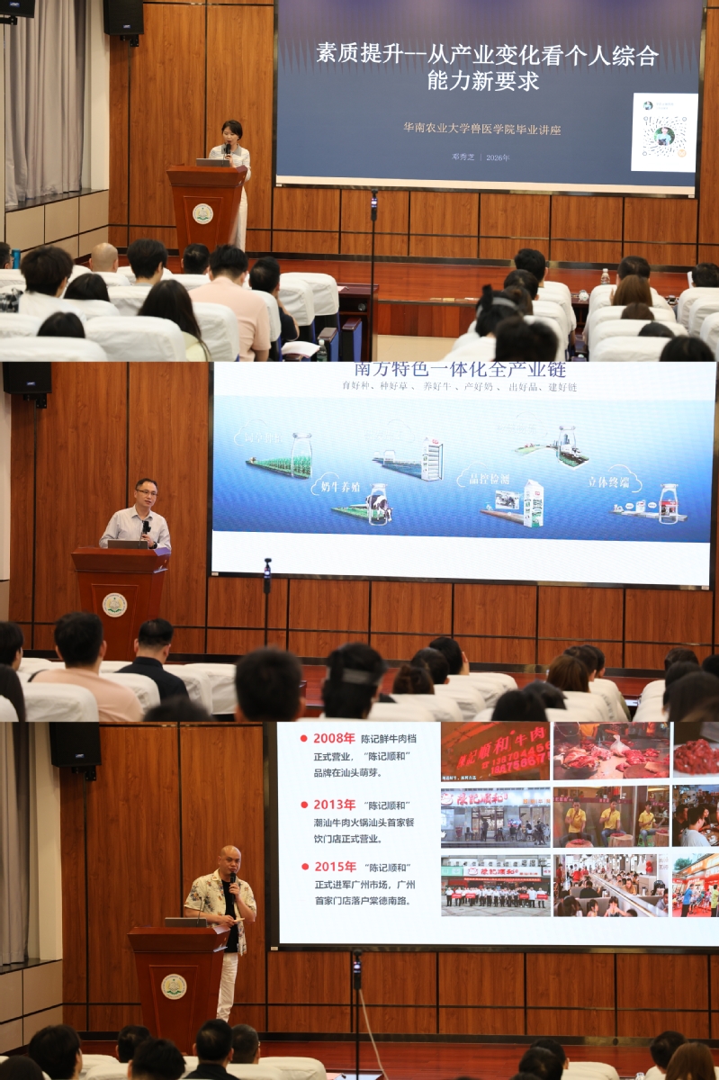 主题分享环节,三位行业大咖结合自身深耕产业的实战经验,为毕业生带来前沿洞察与职业指引。燕塘乳业牧业事业部总经理吴汉葵、佛山市三水区乐家庄养殖有限公司董事长邓秀芝、陈记顺和董事长,广东省牛产业发展促进会会长陈晓申,分别围绕乳品消费升级、产业人才能力要求、畜禽食材品牌化发展作专题分享,深度剖析广东农牧产业转型升级趋势,为毕业生就业择业提供了多维度的行业视角。
