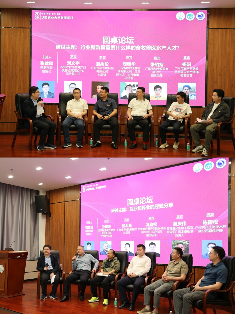 本次活动核心环节圆桌论坛由兽医学院副院长张建民教授主持。第一场论坛以“农牧行业新阶段需要什么样的兽医人才”为主题,行业专家围绕复合型兽医人才培养模式、数字化技能应用、检验检疫能力提升、跨界融合思维培养等提出建设性意见,为学院优化人才培养方案提供一线产业依据。第二场论坛聚焦“畜牧兽医专业就业和择业的经验分享”,企业嘉宾结合从业经历,围绕职业规划制定、岗位适配选择、职场能力提升等内容,为毕业生提供了可借鉴、可操作的实用指导。
